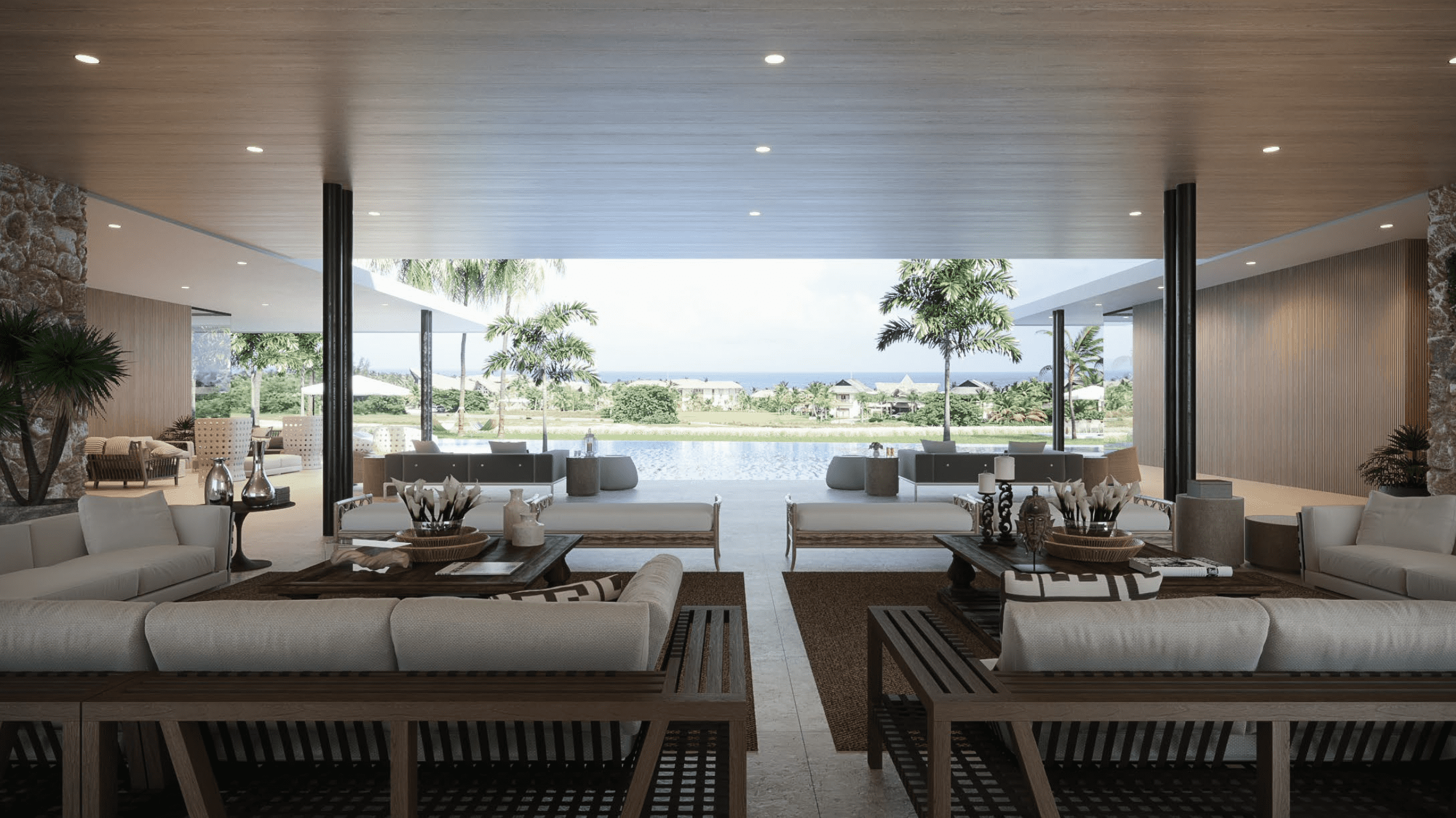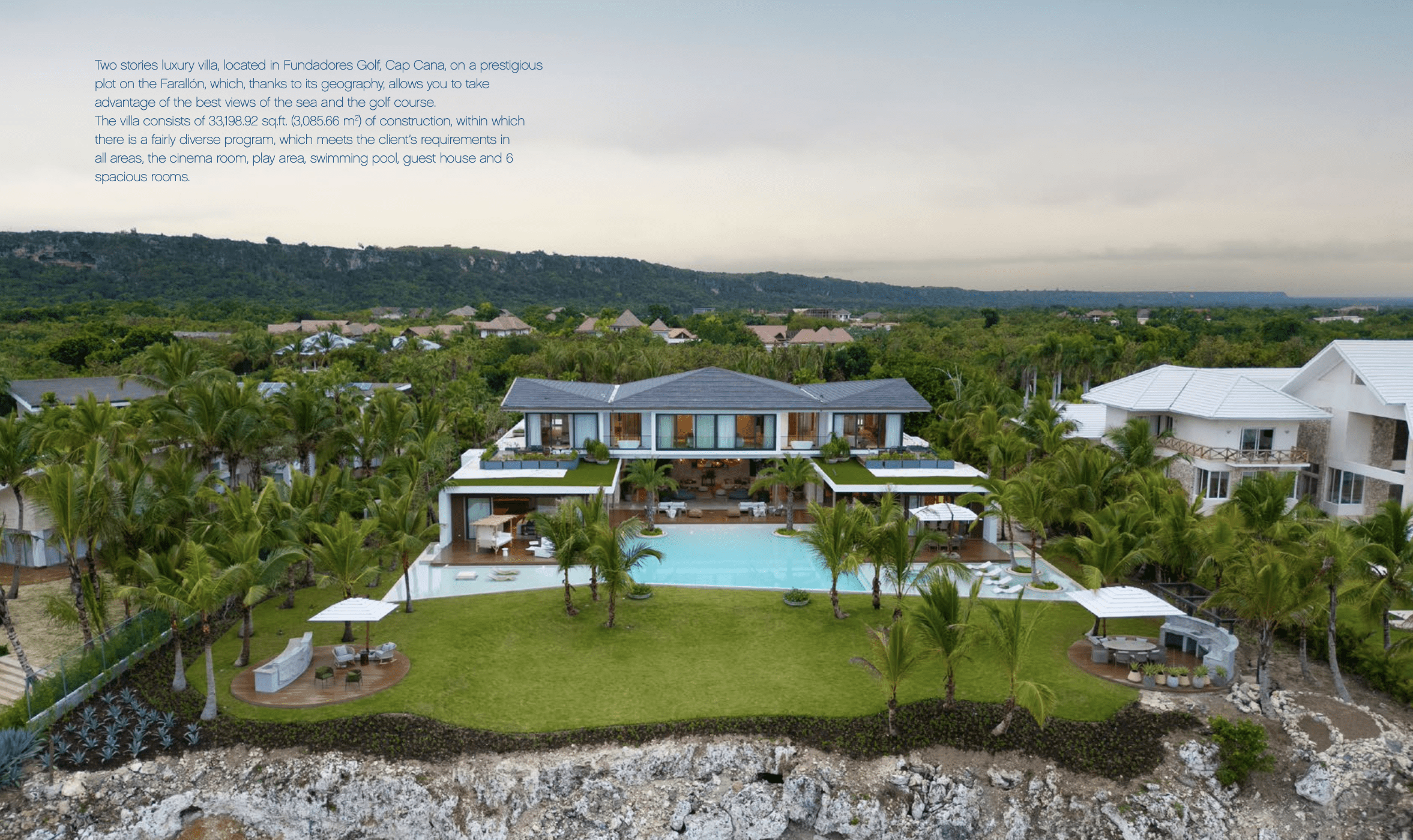Imagine a two-story villa located in Fundadores Golf, Cap Cana, on a prestigious plot in the Farallon, offering the best views of the sea and the golf course. This luxury villa spans 33,198.92 square feet (3,085.66 m2) of construction, with a diverse program that meets all the client’s needs.